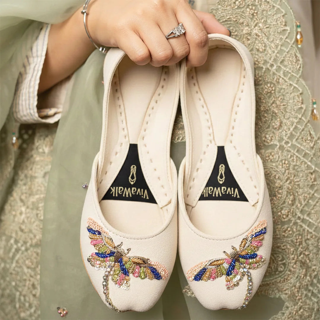 Experience the enchantment of “Dragon Delight” – where mythical charm meets modern elegance. Each pair is a masterpiece, adorned with a mesmerizing array of multi-colored crystals, dabka, zari, kutdana, and sequins, showcasing exceptional craftsmanship. The luxurious velvet upper provides a plush feel, while the sturdy leather bottom ensures durability and comfort. Whether you’re dancing at a soirée or strolling through city streets, “Dragon Delight” captivates all eyes with its enchanting allure. Elevate your style game and own a piece of magic for your feet today!