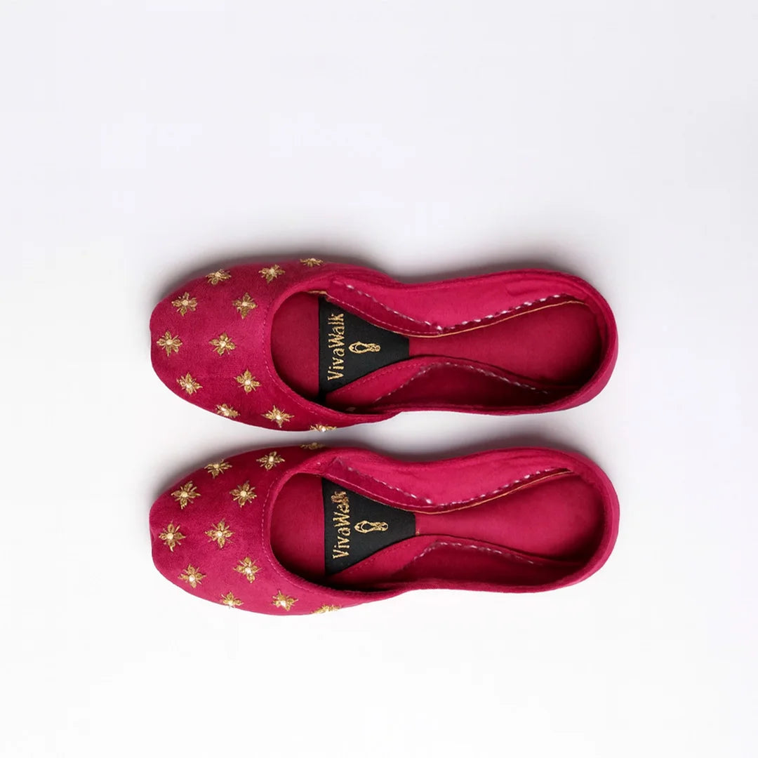 “Behold our majestic Purple Velvet Khussa, featuring a coordinating purple sole and embellished with intricate golden motifs. This handcrafted marvel seamlessly blends opulence with traditional allure, ideal for elevating your look on special occasions and cultural gatherings.”